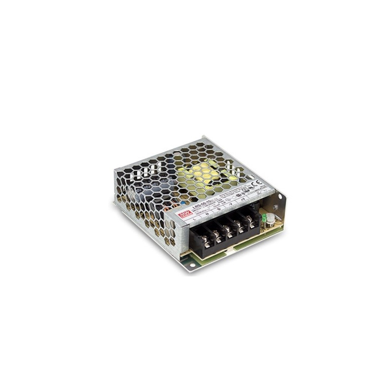 Alimentatore switching Mean Well LRS-50-12 da 12V e 50W, progettato per applicazioni professionali che richiedono affidabilità, compattezza ed elevata efficienza.