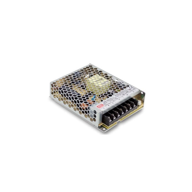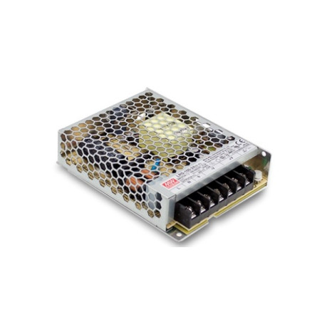 Alimentatore switching Mean Well LRS-100-24 da 24V, progettato per applicazioni professionali che richiedono alta potenza, affidabilità e compattezza.