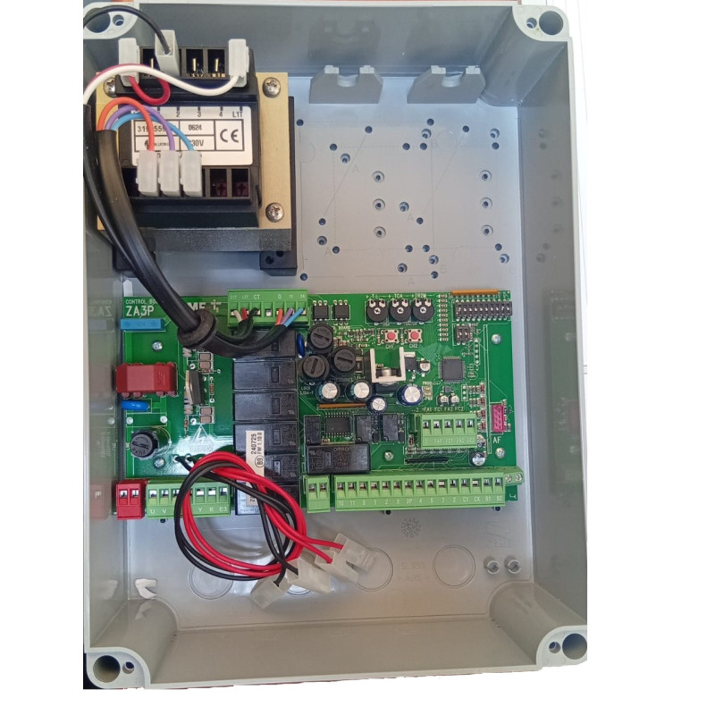 Quadro comando multifunzioni per cancelli a due ante battenti, con gestione di finecorsa e regolazione della velocita' di rallentamento. Contenuto del quadro Morsettiere collegamento Fusibile scheda elettronica Fusibile dispositivi di comando Fusibile accessori Fusibile elettroserratura LED programmazione Pulsanti memorizzazione codice radio Trimmer regolazione tempi Selettori funzioni Innesto scheda radiofrequenza AF LED tensione 24 V presente Trasformatore Prodotto eccellente, realizzato con materiali di alta qualita' e pensato per durare nel tempo.
