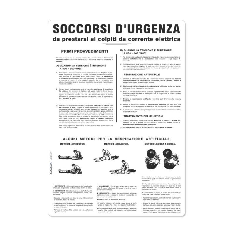 Cartello Grafoplast GRALC14110P1 "Soccorsi d'urgenza da prestarsi ai colpiti da corrente elettrica" in PVC, dimensioni 350x500 mm, fornito in singolo foglio. Ideale per segnalare in modo chiaro e visibile le procedure di pronto soccorso negli impianti elettrici. Prodotto eccellente, realizzato con materiali di alta qualita' e pensato per durare nel tempo.