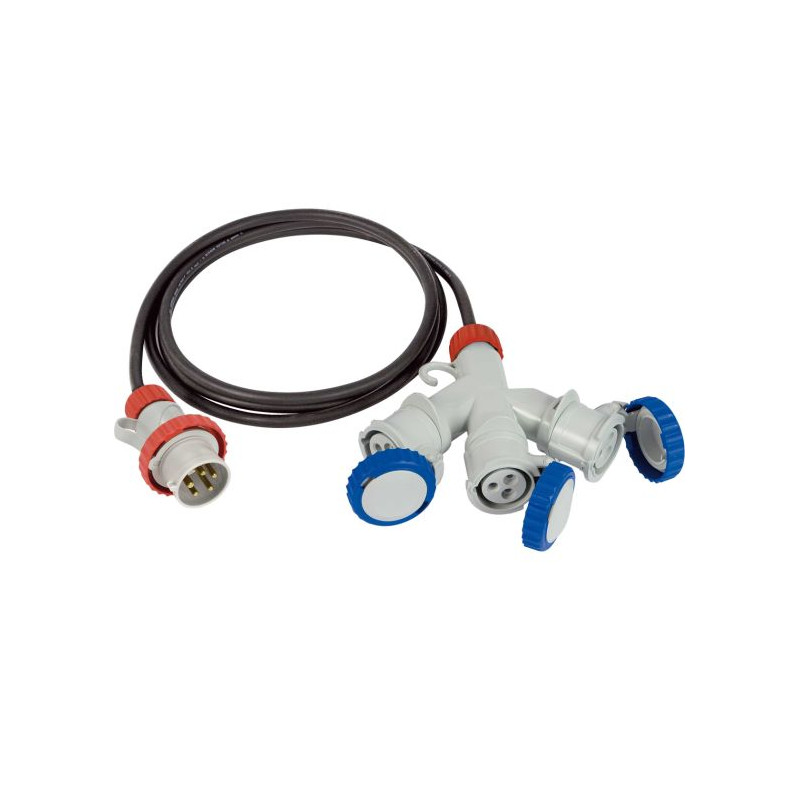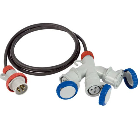 Adattatore multiplo industriale con spina CEE 5 poli (3P+N+T) 16A 380-415V 6h IP67 e tre prese CEE 3 poli (2P+T) 16A 200-250V 6h IP67, dotato di cavo H07RN-F 5G2,5 mm² lungo 2 metri. Fornito in confezione termoretraibile, e' ideale per applicazioni industriali che richiedono un'elevata resistenza agli agenti esterni grazie al grado di protezione IP67. Prodotto eccellente, realizzato con materiali di alta qualita' e pensato per durare nel tempo.
