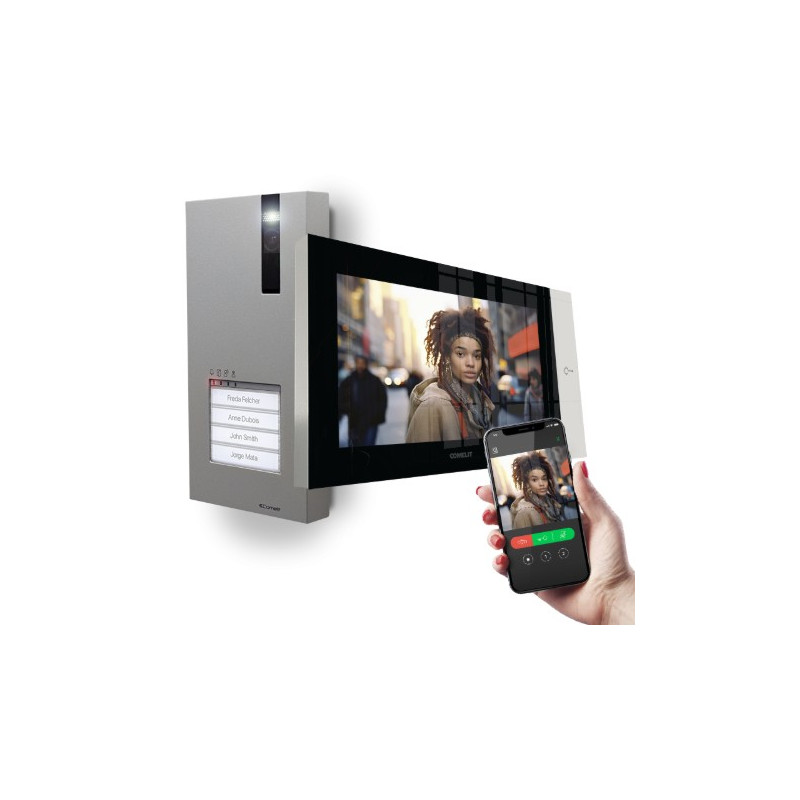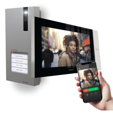 Il kit comprende un posto esterno Quadra a pulsanti (cod. 4899M), un videocitofono 7TOP da 7 pollici con vivavoce e connessione Wi-Fi (cod. TP6842), un iniettore di alimentazione (cod. 1488) e un alimentatore da 30W (cod. 1441B). Gia' preconfigurato e pronto all'installazione, il sistema può essere ampliato con altri dispositivi della gamma ViP utilizzando l'articolo 1440A (venduto separatamente). L'abbinamento con l'app Comelit, disponibile gratuitamente per iOS e Android, permette di gestire le chiamate citofoniche direttamente dallo smartphone o tablet, sia in locale che da remoto, garantendo controllo e flessibilita' d'uso. Il kit offre una soluzione completa per un sistema di videocitofonia moderno e integrato. Prodotto eccellente, realizzato con materiali di alta qualita' e pensato per durare nel tempo.