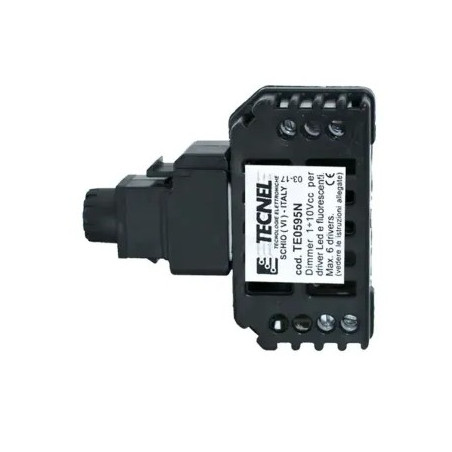 Dimmer 0/1-10Vcc attivo per max 15 unita' dimmerabili, con comando tramite potenziometro e manopola, installabile in 1 modulo serie civile con adattatori Tecne'l. Regola la luminosita' di LED panel, downlight, applique, strip e tubi fluorescenti dimmerabili 0/1-10Vcc. Per piu' di 15 unita' e' necessario un amplificatore di segnale (codice AMP110). La manopola aumenta o diminuisce il segnale da 0 a 10V per regolare la luce. Con segnale 10V luce massima, a 0V lo spegnimento dipende dal protocollo (0-10V si spegne, 1-10V resta minima e richiede rele' per spegnimento completo). Prodotto eccellente, realizzato con materiali di alta qualita' e pensato per durare nel tempo.