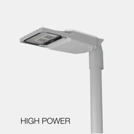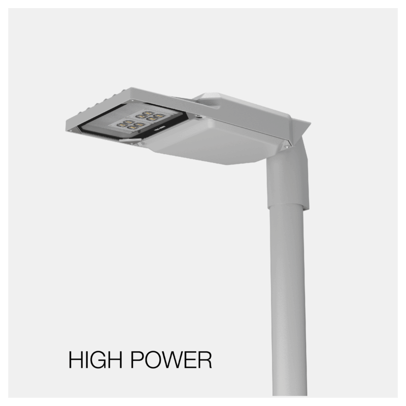 Il proiettore può essere installato su testa palo, braccio orizzontale, mezzo palo (singolo o doppio) o a parete, con attacco regolabile Ø 60 mm. L’ottica asimmetrica media 45° stradale IESNA Tipo II con lenti PMMA assicura una distribuzione uniforme della luce.