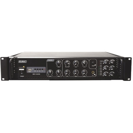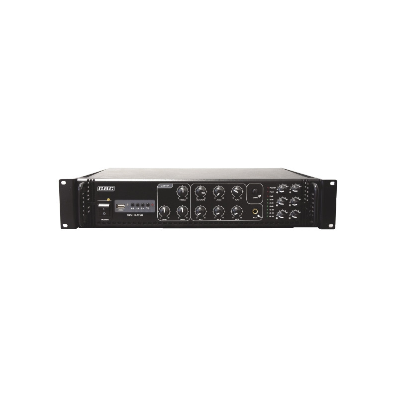 Amplificatore integrato di potenza progettato per sistemi Public Address, ideale per applicazioni complesse e ad alto carico. Dotato di terminali a vite per l’uscita su 6 zone con controlli di volume indipendenti, permette una gestione precisa dell’audio in ambienti differenti. Include lettore MP3 tramite porta USB/SD, raffreddamento attivo a ventola, 3 ingressi microfonici (uno sul pannello frontale con funzione di priorita' e controllo toni) e 3 ingressi ausiliari, oltre a un’uscita linea per connessioni esterne. Supporta uscite PA a 70V/100V e uscita a bassa impedenza (4-16 Ohm) per collegamento diretto ad altoparlanti passivi da monitor, con potenza di uscita inferiore a 1/3 di quella nominale. Struttura robusta e funzionalita' avanzate lo rendono adatto a scuole, centri commerciali, aziende e strutture pubbliche. Prodotto eccellente, realizzato con materiali di alta qualita' e pensato per durare nel tempo.